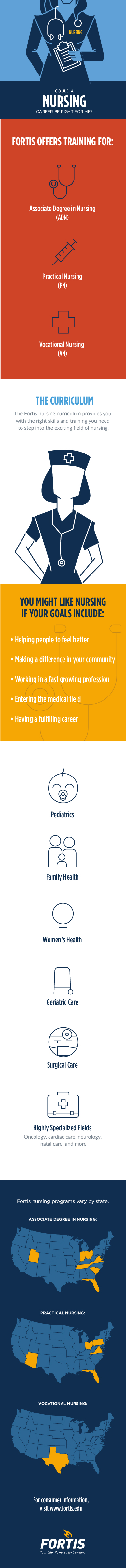Fortis offers multiple nursing programs across various campuses including an Associate Degree in Nursing, along with training in practical and vocational nursing. For more information about the Fortis nursing curriculum and program locations, visit our Nursing programs page.